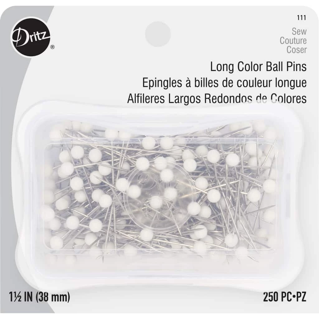 Dritz Long Color Ball Pins are ideal for quilt basting and home dΓ©cor sewing. Large white heads are easy to see and handle.
