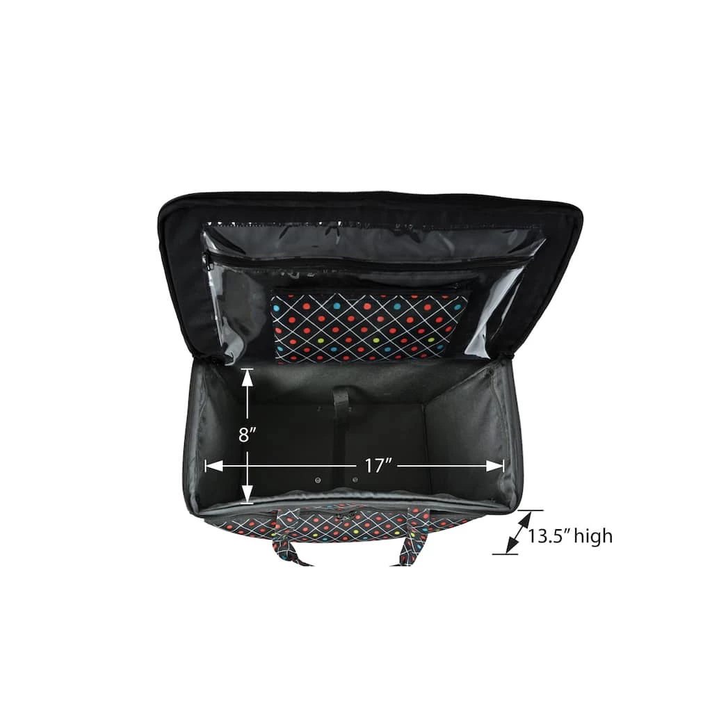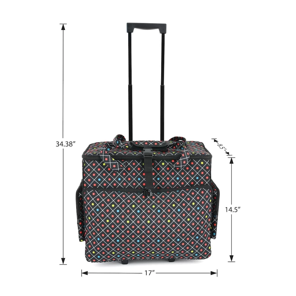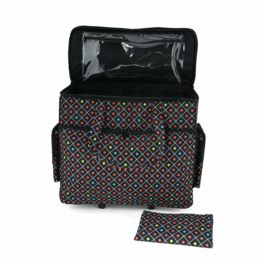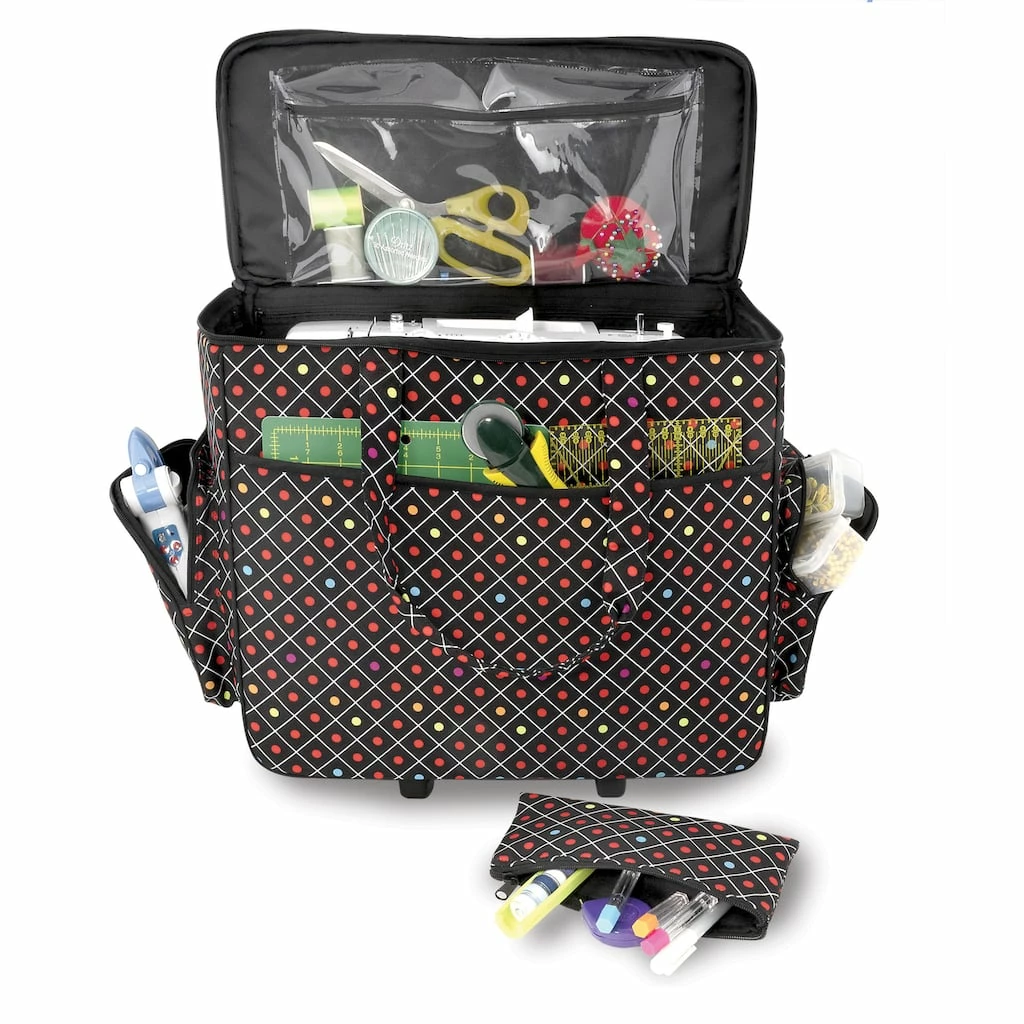 A rolling sewing machine tote is a must for transporting a sewing machine to classes and retreats. Sewists, quilters and crafters will appreciate the ease of a wheeled tote. Convenient zippered pockets securely hold sewing accessories. The matching accessory case is ideal for small tools. Colorful diamond dot pattern with black trim.ย ย ย