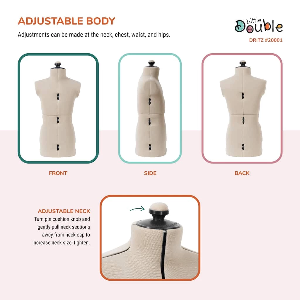 - Adjustable body: 12 soft-grip rolling wheels adjust form in precise increments to match child’s measurements at chest, waist and hips; manually adjust neck cap to increase neck size