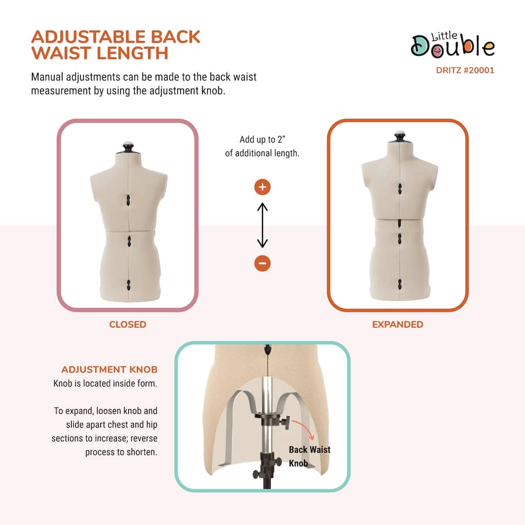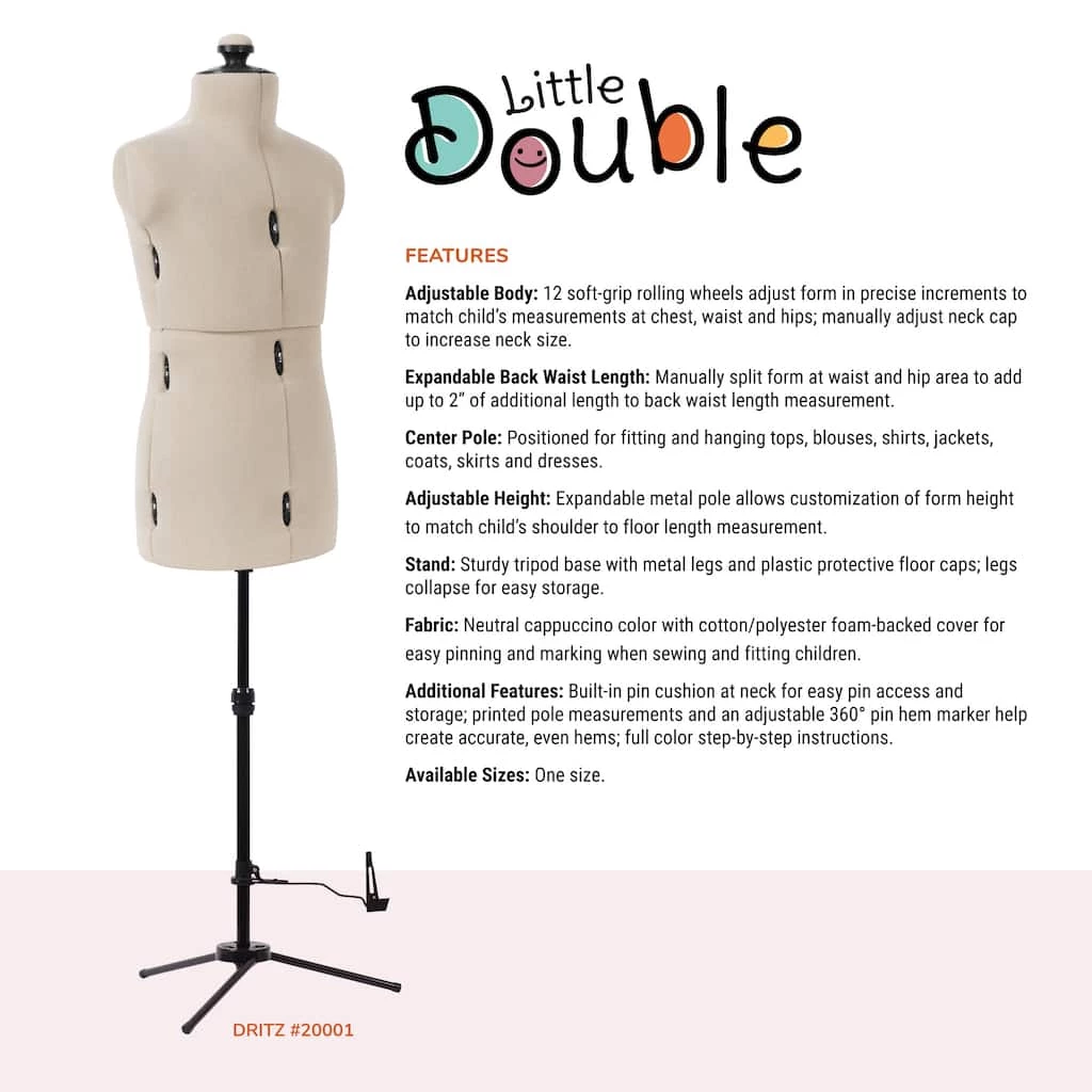 This adjustable dress form is designed to assist in the sewing and fitting of childrenβs clothing. The body sizing and proportions are best suited for girls and boys in the 6 to 10 years age range. Use the form to audition fabrics and test the drape and overall look and feel before you start your project. The form is ideal for checking the fit of your pattern tissues and garment test muslin. The form assists with modifications and alterations to both new construction and ready-to-wear clothing that requires modifications.Β