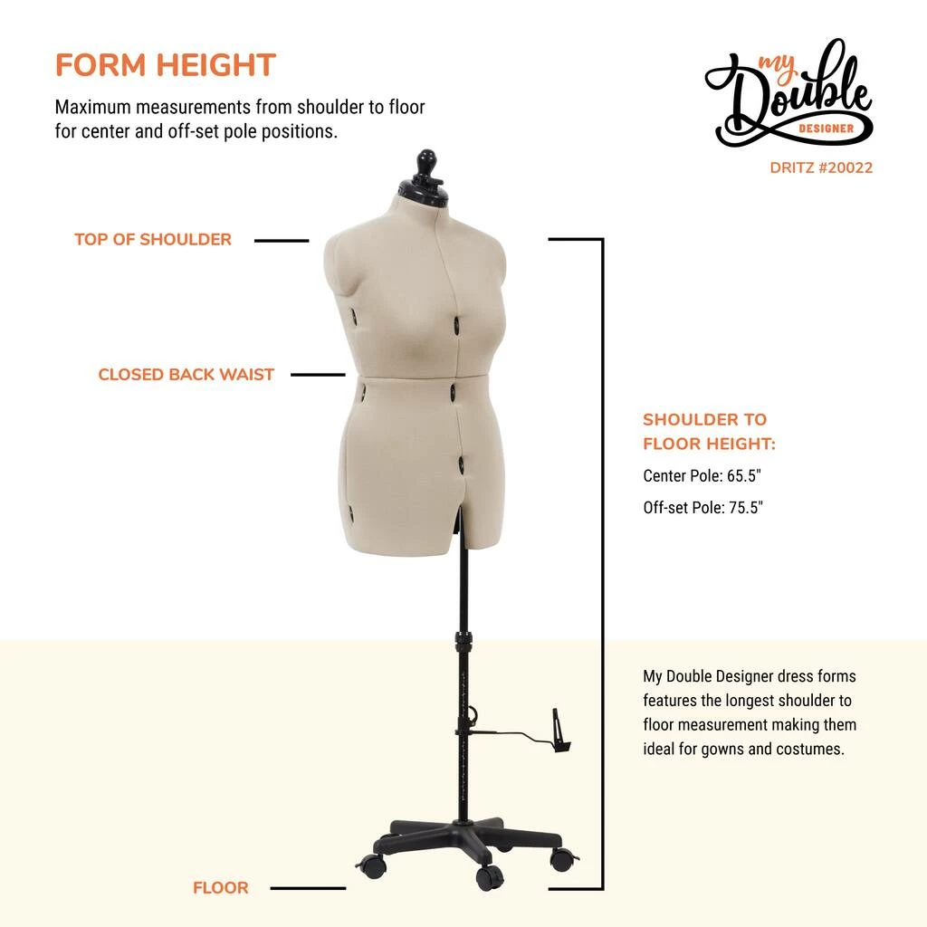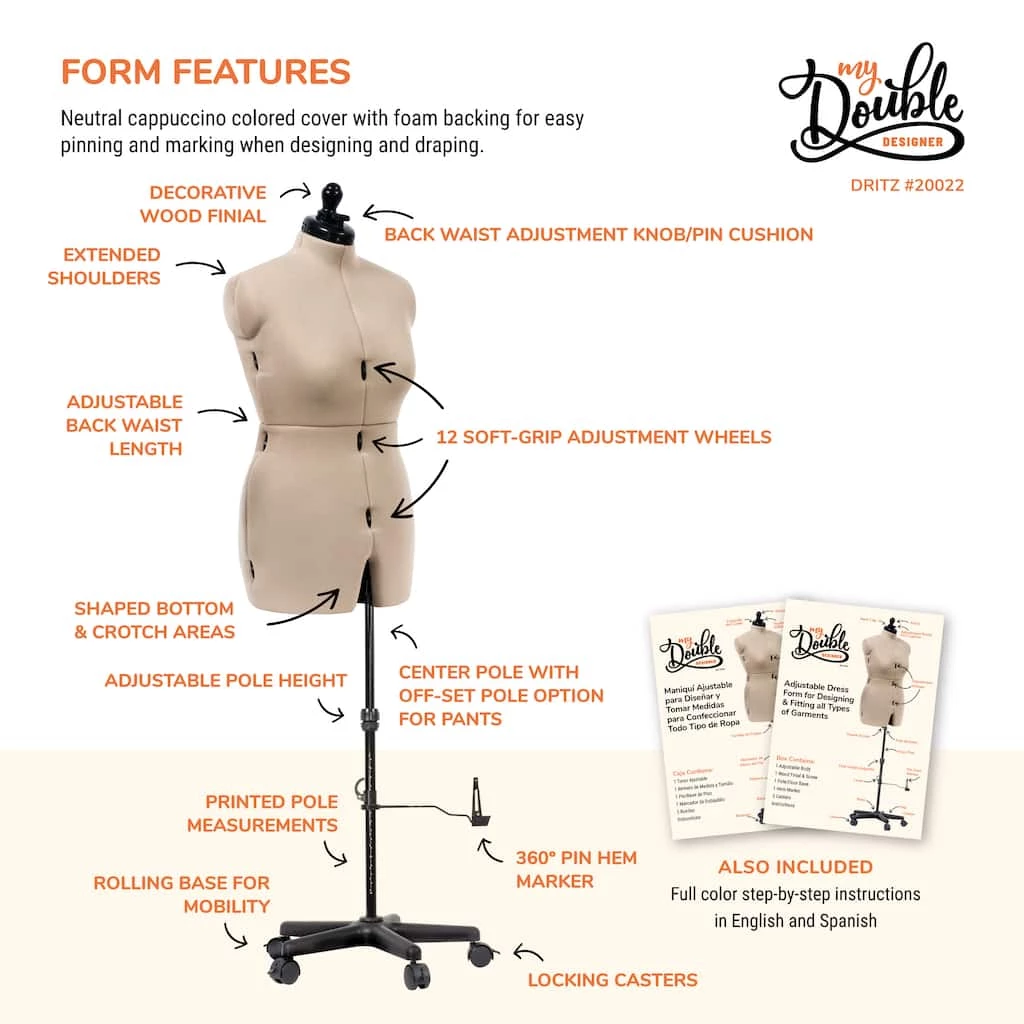 - Adjustable body: 12 soft-grip rolling wheels adjust dress form in precise increments allowing you to customize the form to match your bust, waist, and hip measurements; decorative wood finial adjusts neck size