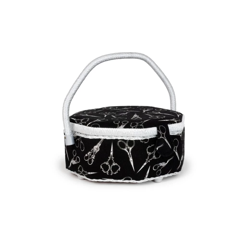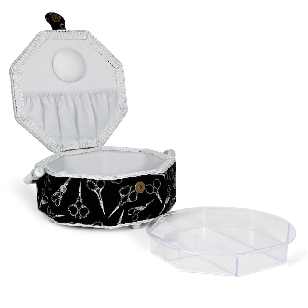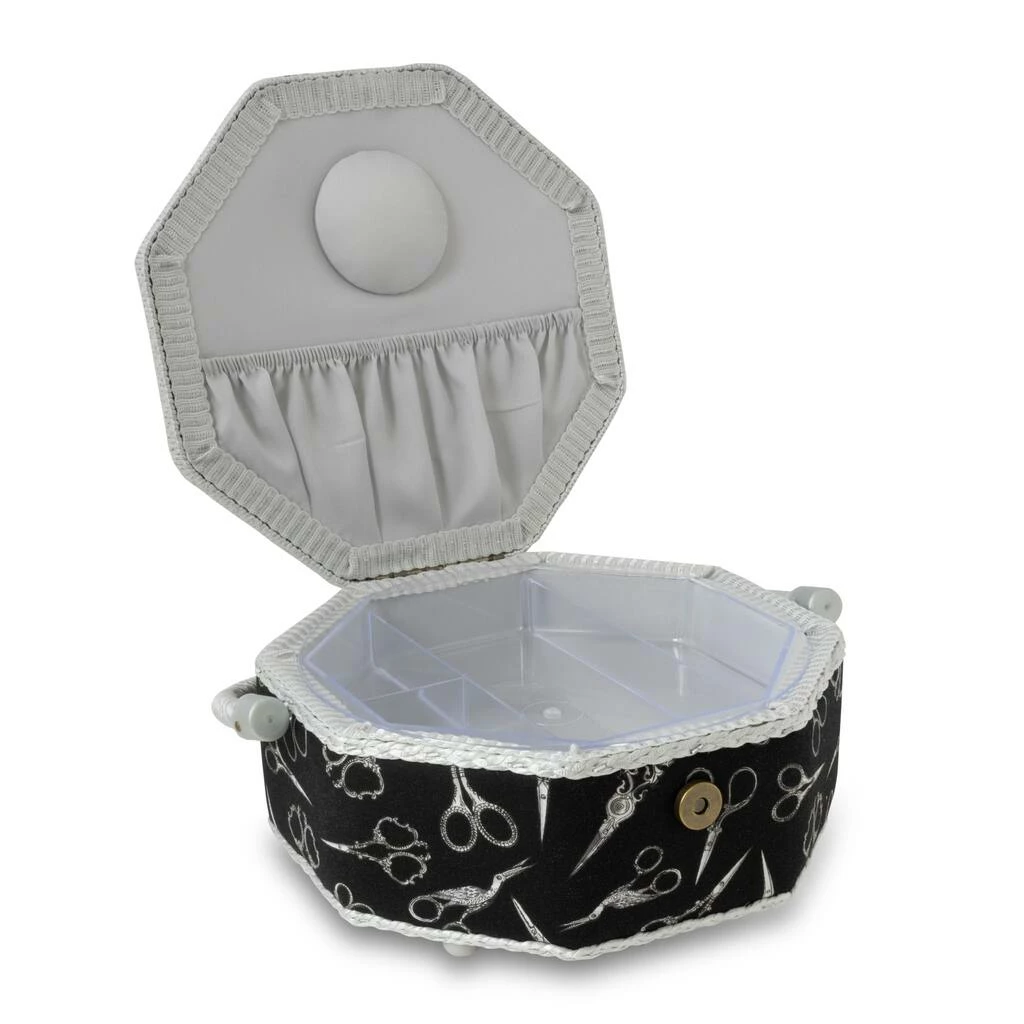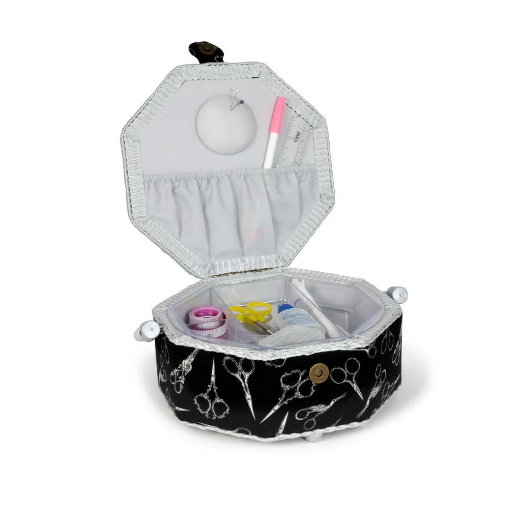 This pretty octagon shaped Dritz sewing basket is an ideal size to keep basic sewing or embroidery supplies handy. The fabric is printed with silver scissors tossed on a black background. The silver gray handle, trim and lining add an elegant touch.