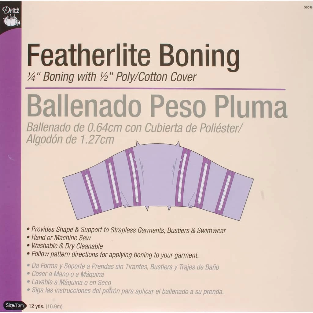Boning provides shape and support to strapless garments such as bustiers, swimwear, theatrical costumes, evening wear and soft toys. This boning can be sewn on by hand or machine. This boning features a 1/2″ poly/cotton covering over 1/4″ boning.