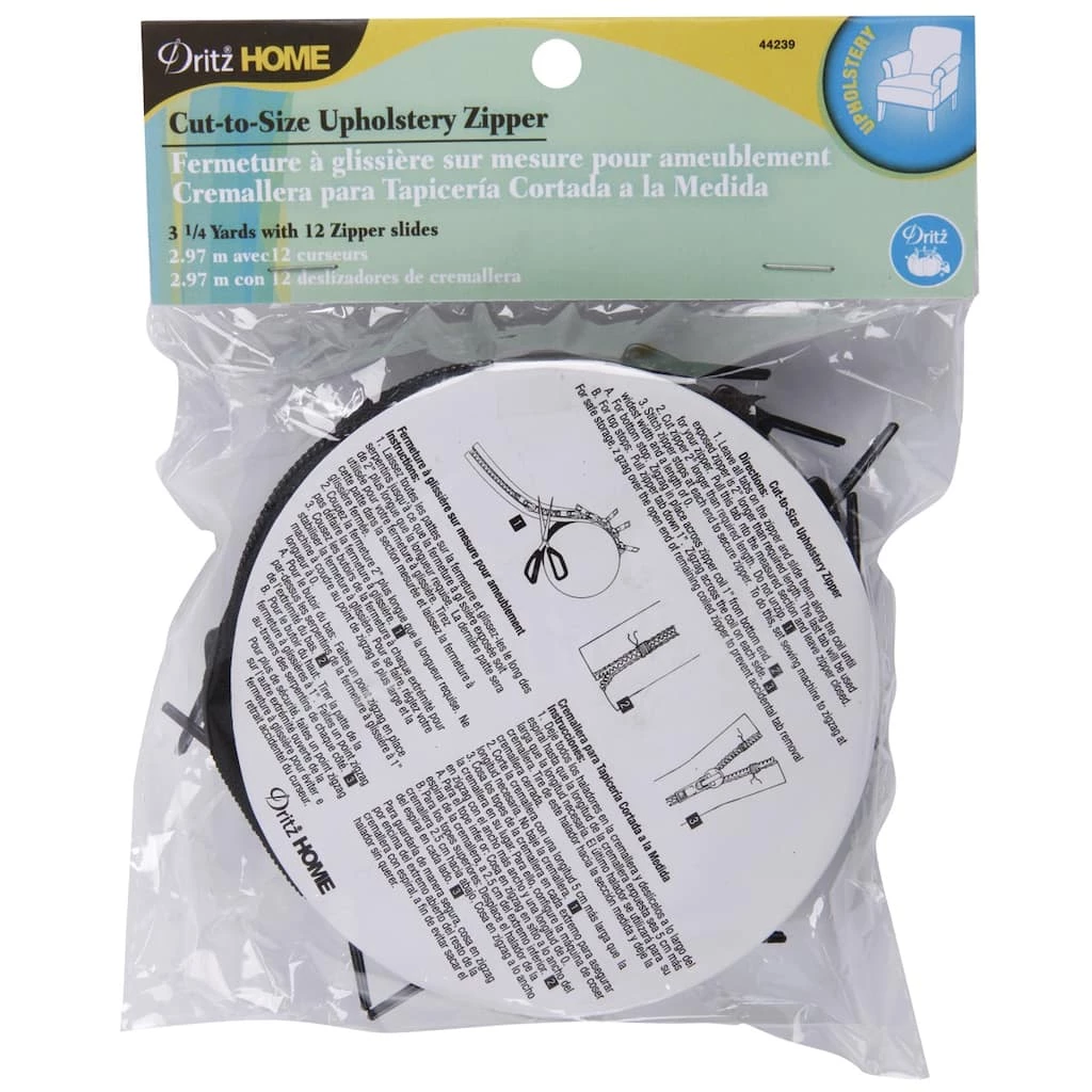 DRITZ-Cut-To-Size Black Nylon Zipper is perfect for any project. This package contains one 3.25 yards of black nylon with twelve zipper slides. Imported.
